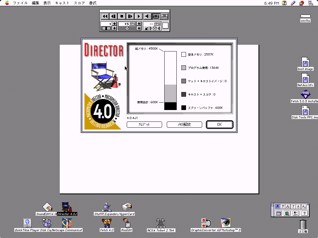 そこで知り合った人に、Macromedia Directorを教えていただきました。以下にそのときの画面キャプチャを貼り付けますが、これは以前のHDの中身をBasiliskで動かしているものです。